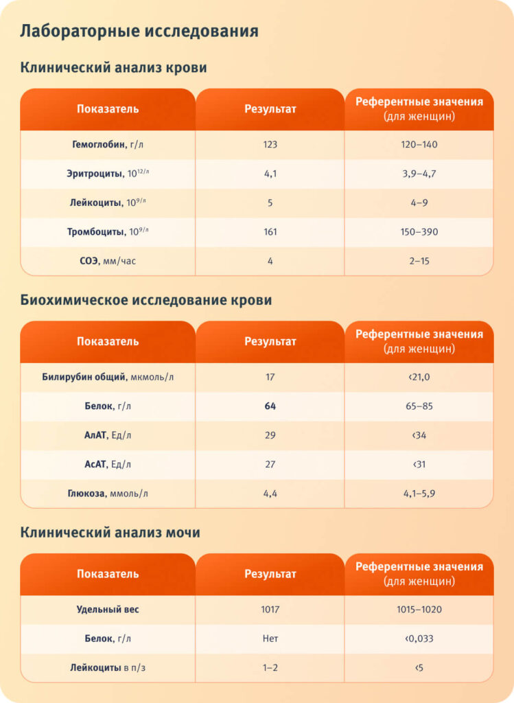 Общее состояние удовлетворительное. Кожа и видимая слизистая оболочка: бледные, чистые. Аускультативно — в легких везикулярное дыхание, тоны сердца ритмичные, звучные. АД — 120/70 мм рт. ст. ЧСС — 72 уд./мин. Живот мягкий, безболезненный при пальпации. Симптом Пастернацкого отрицательный с обеих сторон. Отеков нет.