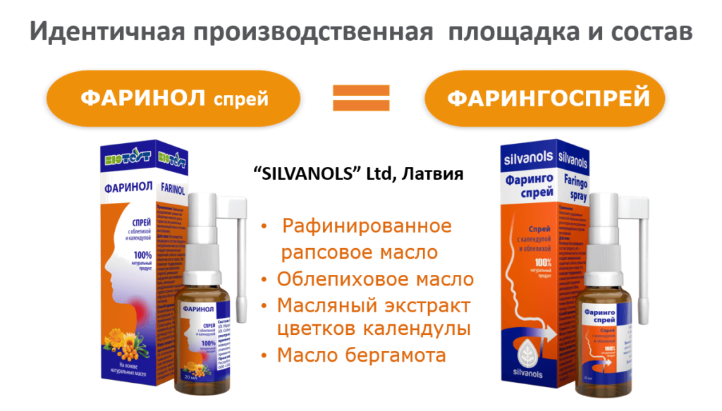 В составе Фаринол спрея только натуральные масла: облепиховое, масло календулы и бергамота. Комбинация масел обладает противовирусным, антибактериальным и противогрибковым действием, уменьшает ощущение дискомфорта и боль, облегчает процесс глотания, оказывает противовоспалительное действие, способствует заживлению поврежденной слизистой.