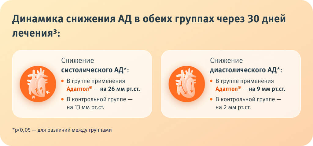 Клиническая эффективность Адаптол® при АГ с тревожным и вегетативным компонентом подтверждена рядом исследований, в которых препарат рассматривался как дополнение к базовой антигипертензивной терапии.