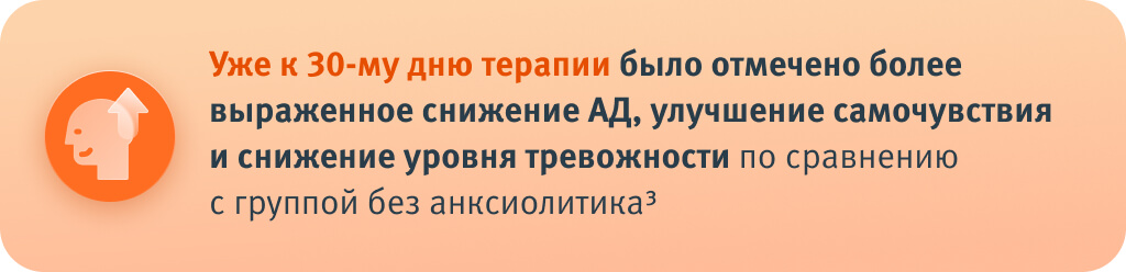 Важно отметить, что колебания АД часто обусловлены не только органическими нарушениями, но и психоэмоциональными факторами, прежде всего — тревожными расстройствами1. Поэтому в ряде случаев стандартной антигипертензивной терапии может оказаться недостаточно. Для стабилизации суточного профиля АД требуется комплексныйподход, включающий коррекцию тревожного компонента, например, с включением в схему лечения анксиолитиков с вегетостабилизирующим действием.