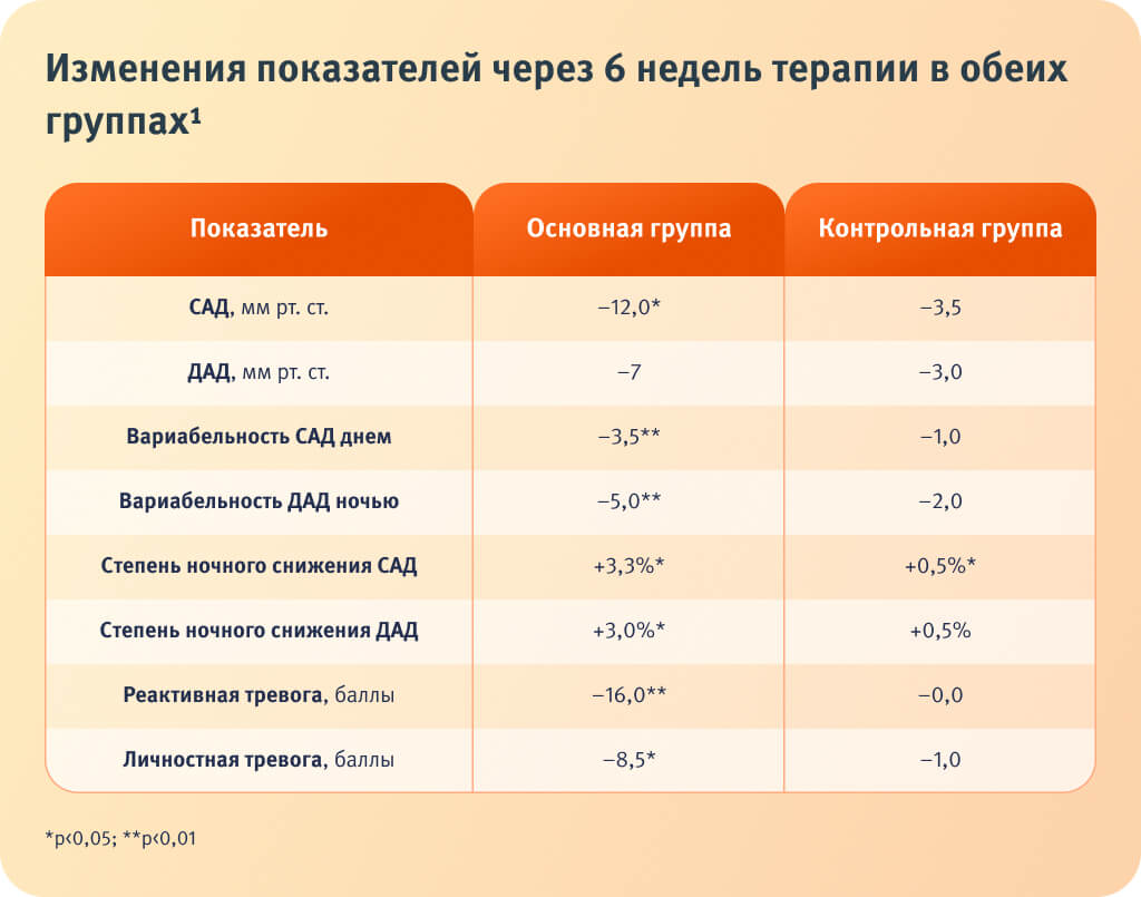 Через 6 недель оценивали изменения основных показателей контроля АГ и уровня тревоги1.