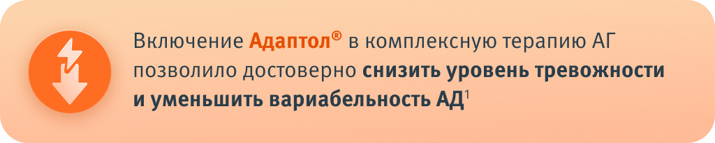 Добавление Адаптол®к стандартной антигипертензивной терапии у пациентов с тревожностью и нестабильным профилем АД позволяет достоверно улучшить его контроль, снизить вариабельность и нормализовать психоэмоциональное состояние. Препарат может рассматриваться как обоснованный компонент комплексного подхода при лечении АГ с вегетативными и тревожными проявлениями1-3.