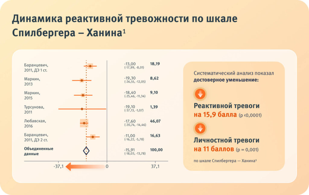 Достоверное снижение выраженности реактивной тревоги на 15,9 балла и личностной тревогина 11 баллов по шкале Спилбергера — Ханина