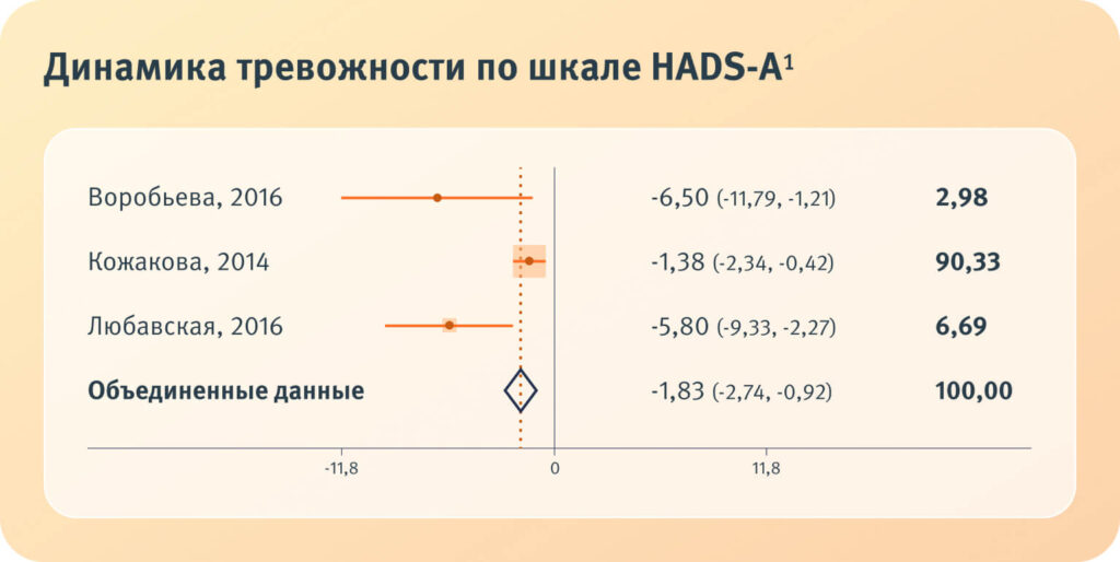 Уменьшение интенсивности тревогина 1,8 балла по шкале HADS
