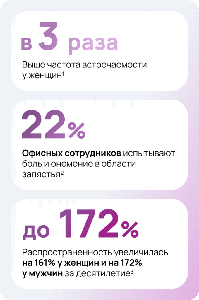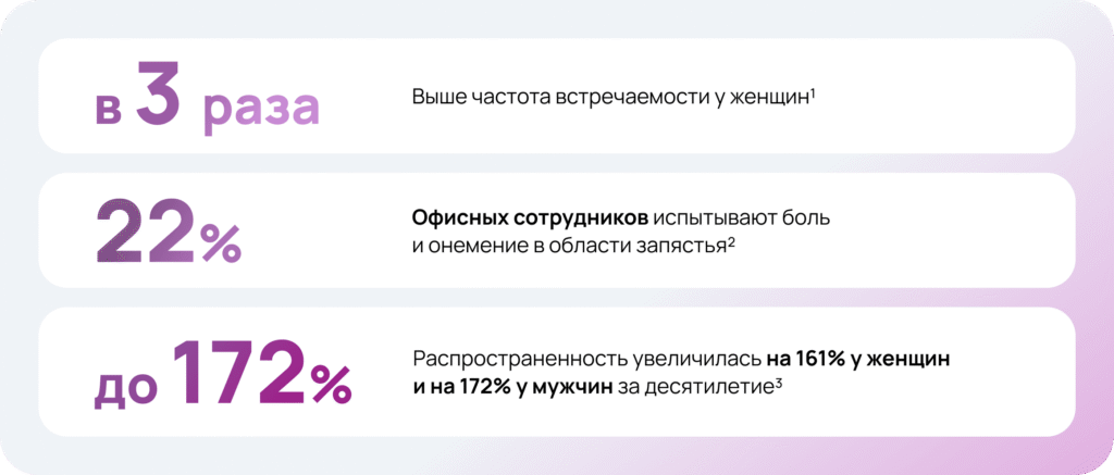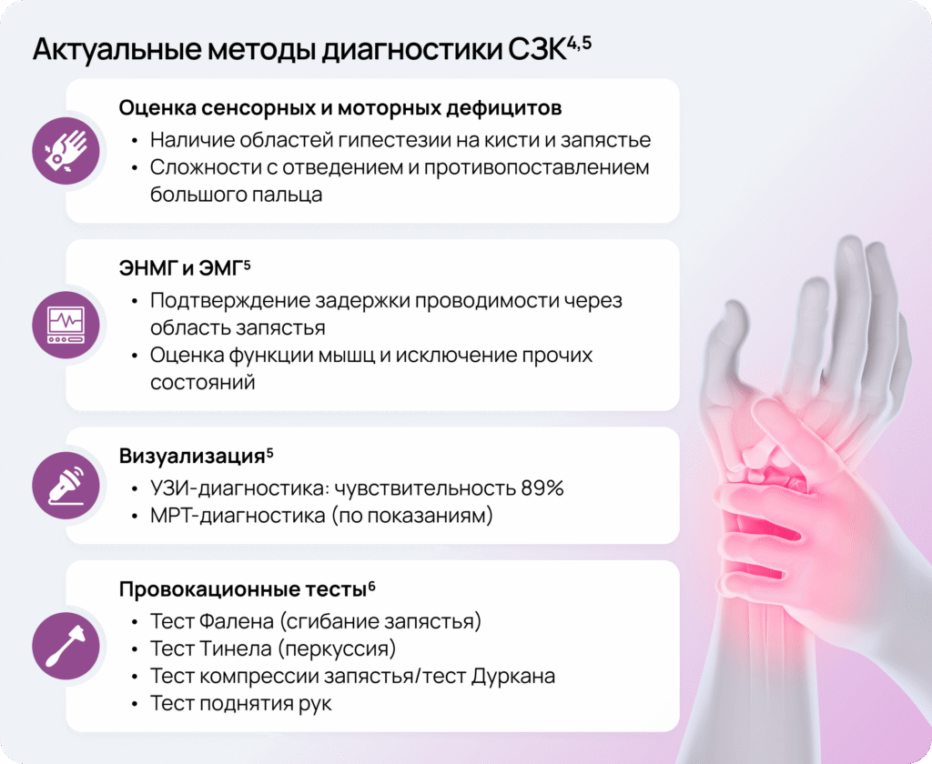 Высокая распространённость синдрома запястного канала (СЗК) снижает качество жизни пациентов и увеличивает нагрузку на систему здравоохранения4. Современные методы диагностики и терапии позволяют обеспечить эффективную поддержку таких пациентов.