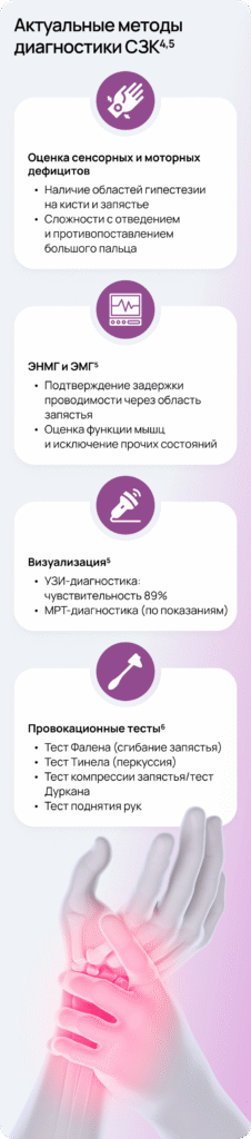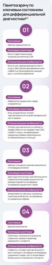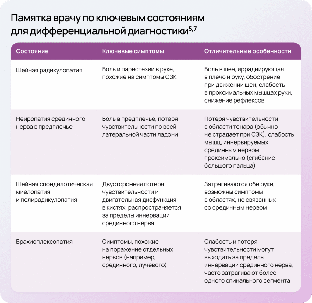 При типичных проявлениях синдрома запястного канала постановка диагноза не затруднительна, однако у части пациентов симптомы могут быть атипичными или напоминать другие заболевания, что требует дифференциальной диагностики5,7.