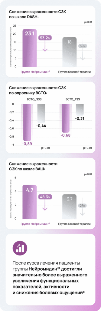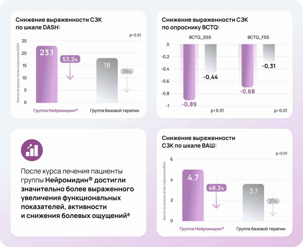 В базовую терапию были включены НПВС, сосудистые средства, витамины группы В. Курс терапии длился в среднем 67 дней. Группы оценивались до и после курса терапии с использованием шкал DASH, BCTQ и ВАШ.
