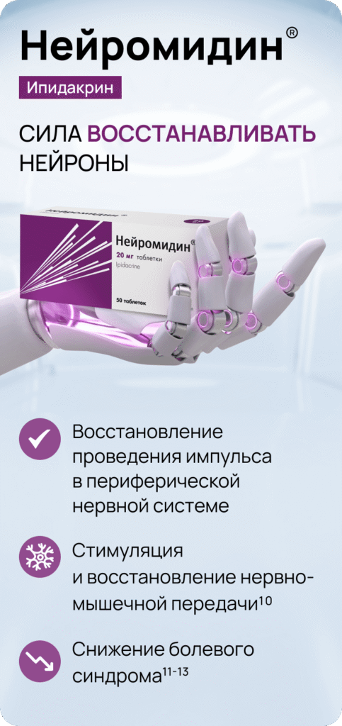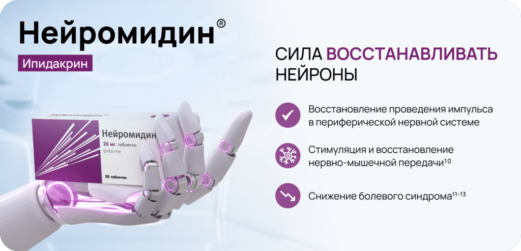 Нейромидин® (Ипидакрин) повышает чувствительность рецепторов постсинаптической мембраны к ацетилхолину, что позволяет эффективнее передавать сигналы от нервов к мышцам9.