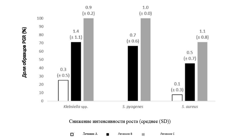 Среднее снижение роста составило около одного квадранта для всех видов лечения, за исключением S.pyogenes при лечении A (без снижения) и S. aureus при лечении B (1,2) и лечении C (1,4) (рисунок 1).
